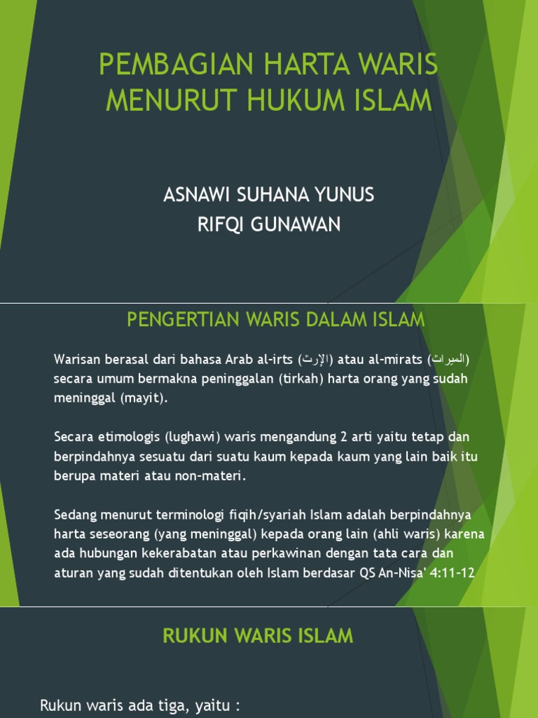 Hukum Waris Islam 1 Abdul Ghofur Anshori from image.slidesharecdn.com Berdasarkan amalan, pengaruh adat ini mengatasi peraturan yang ditetapkan dalam agama. Dari satu sudut pembahagian pusaka, islam menggunakan sistem individu, hal ini bererti bahawa harta pusaka dapat dibahagikan untuk dimiliki secara perseorangan. Dalam pengurusan harta pusaka orang islam. Amat penting masyarakat sekarang menguasai aspek pengurusan harta pusaka kerana ia sangat kompleks untuk difahami secara teori dan praktikal. Pengurusan harta pusaka islam bermula setelah berlakunya kematian dan selesainya proses pengebumian jenazah. Perancangan pusaka menurut kehendak pemberi hibah berdasarkan konsep keadilan yang selaras dengan syari'at islam. Simpanan kwsp berpenama / tiada penama; Halaman 5 dari 7 kedudukan baitulmal dalam pengurusan harta pusaka.